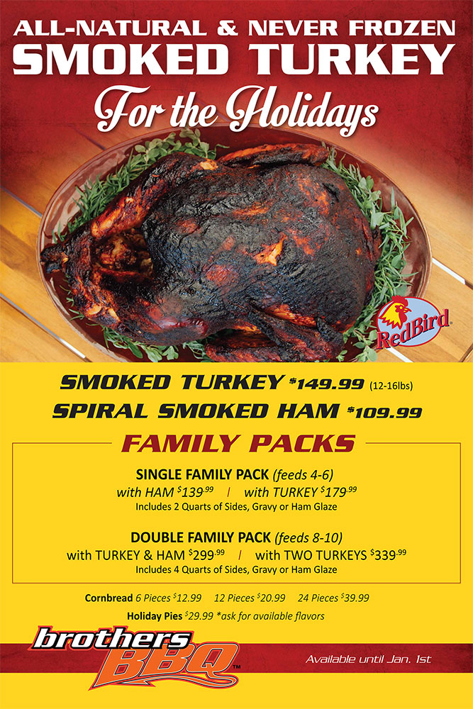 Call your local Brothers BBQ location today to reserve your Turkey!