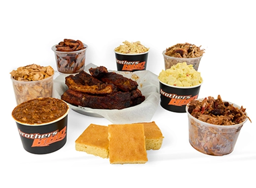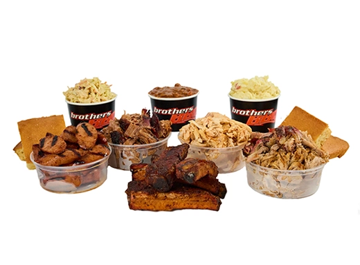 Serves up to 6 people. Half-pound of each: Beef Brisket, Pulled Pork, BBQ Chicken, and Hot Links. Also served with 8 Pork Spare Ribs, 3 Sides (1 Pint ea.) and 8 buns.