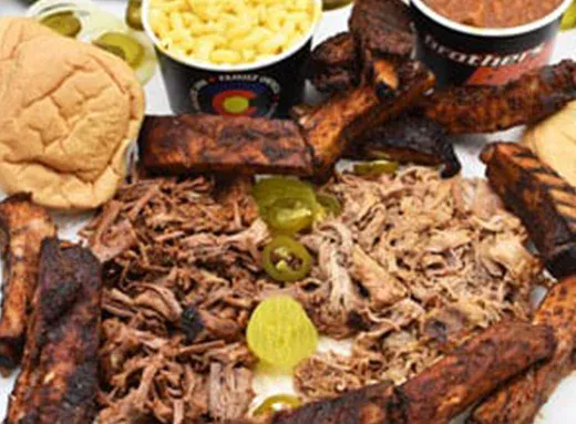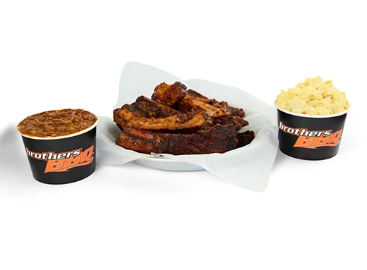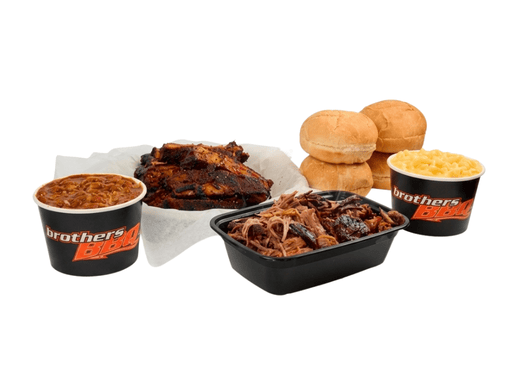Serves up to 6 people. 12 Pork Spare Ribs with your choice of 1 lb. of Beef Brisket, Pulled Pork, BBQ Chicken, or Hot Links. Served with 2 Sides (1 Pint ea.) and 4 buns. Add $6 for beef.