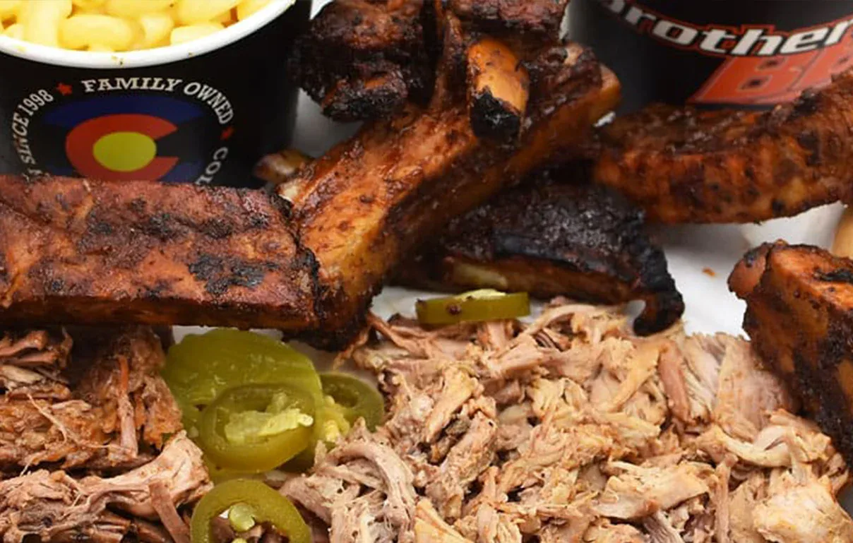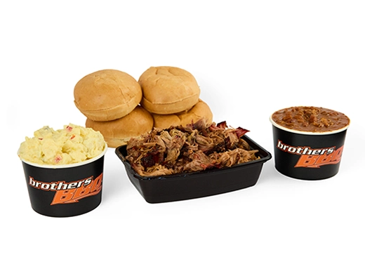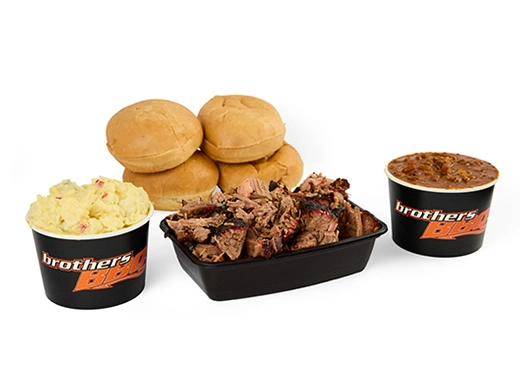 Serves up to 14 people. 1-Pound of each: Beef Brisket, Pulled Pork, BBQ Chicken, and Hot Links. Also served with a Full-Slab of Pork Spare Ribs, 3 Sides (1 Quart ea.) and 16 buns.